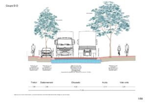 - La création d’une voie verte (piétons + cycles), de trottoirs et stationnements