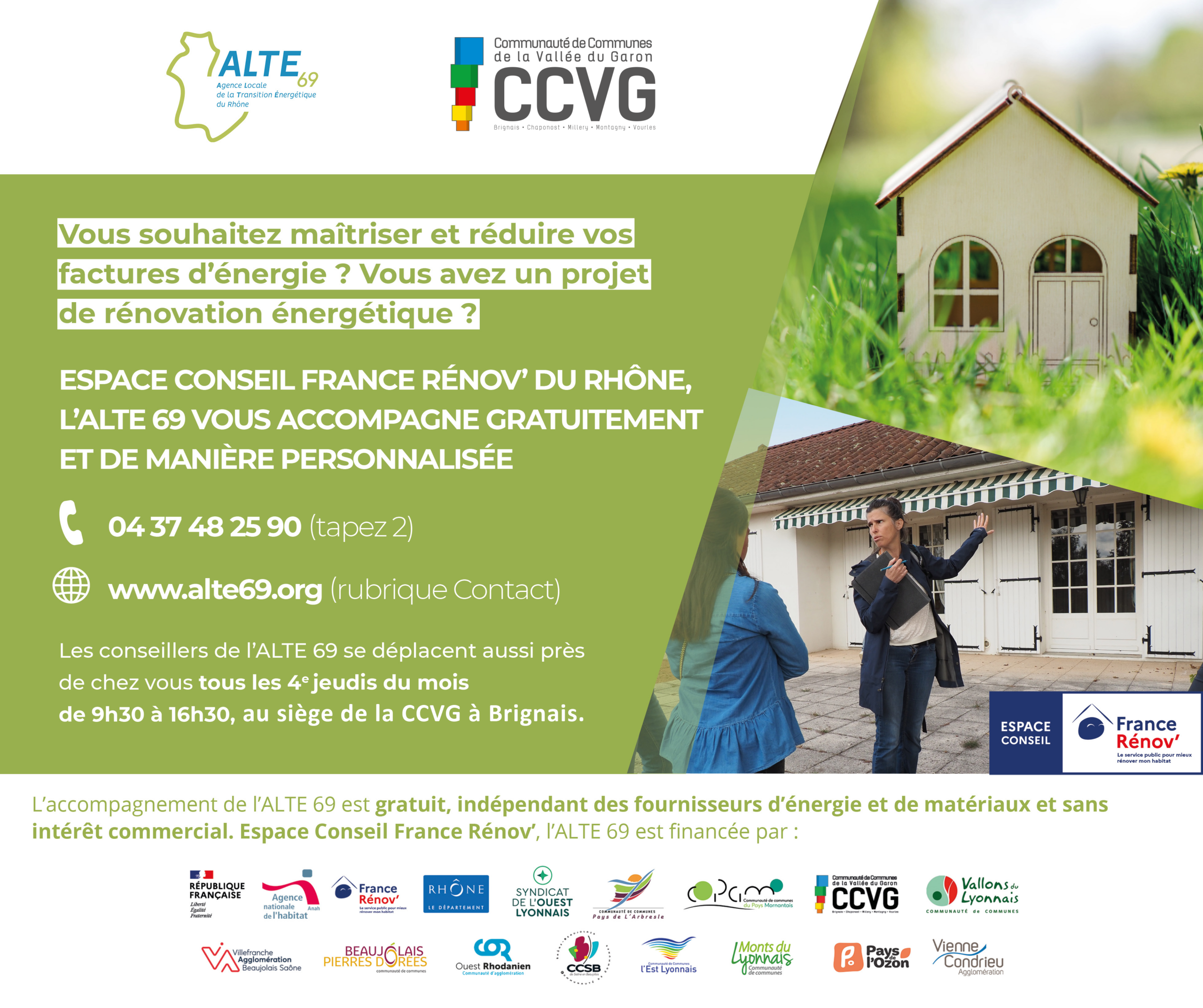 En 2026, des permanences sur rendez-vous seront assurées tous les 4e jeudi du mois par l’ALTE69 pour renseigner et accompagner gratuitement les habitants du territoire sur toutes les questions liées à l’énergie : rénovation énergétique performante, aides financières, énergies renouvelables, économies d’énergies, etc.